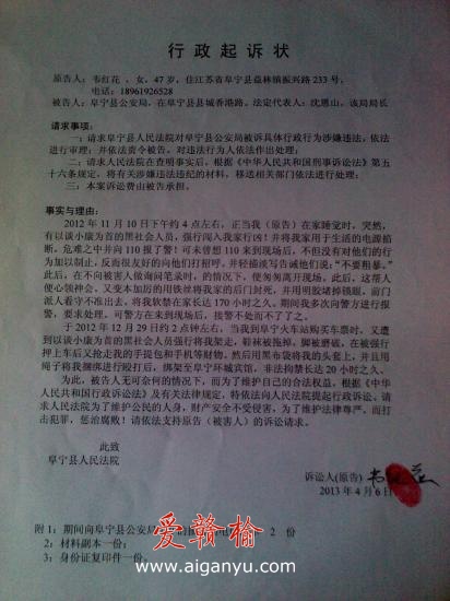 | 反映盐城阜宁人民法院不依法给予答复作者:韦红花 发布时间:2013-06-04 12:02 类别:百姓权益 区域:盐城阜宁 投诉报料: 江苏省阜宁县公安局报警踢皮球推诿不作为,公安护一方太平本是职责所在,报警不处警是渎职犯罪。 我于4月20日向阜宁县人民法院提起行政诉讼,根据《中华人民共和国行政诉讼法》第六章,第42条的规定“人民法院接到起诉状,经审查,应当在七日内立案或者作出裁定不予受理。原告对裁定不服的,可以提起上诉。”7天内,阜宁县法院要么给立案通知,要么给不立案的裁定。可阜宁县法院到现在没有答复。 请阜宁县人民法院依法给予答复,请领导为我做主! ![]() ![]() ![]() |
