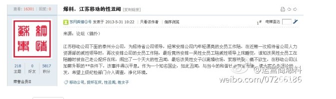 运营商爆料:【这下糗大了】泰州移动为招待省公司领导,经常安排公司内年轻漂亮的女员工作陪,在近期一次招待省公司领导时,再次安排公司的女员工作陪,最后竟然安排一吴姓女员工陪领导上床睡觉,谁知该员工在陪睡时被自己老公捉奸在床........ 在当今社会,性贿赂实质上是典型的权色交易,也是一种新型的腐败现象,令人深恶痛绝。腐败与性贿赂通常是并生的,想不到泰州市的豪华吃喝风,已经转移到“床上服务”了。 江苏移动公司公司下面的泰州分公司,为款待省公司指导,经常布置公司内年轻漂亮的女员工作陪,在近期一次款待省公司人力资源部的戚姓指导时,再次布置公司的女员工作陪,最后居然布置一吴姓女员工陪戚姓领导上床睡觉,谁知该吴姓女员工在陪睡时被本人老公捉奸在床,闹出了一个天大的性丑闻,最后该吴姓女子以离婚收场,家庭决裂,痛不欲生,在移动公司以加薪升职的条件下,该事情得以停息。作为一个知名国企,如此丑闻,与当今的和谐社会南辕北辙,希望上级纪检部门介入调查,净化环境。 运营商爆料:戚姓领导叫做叫戚兆军,为泰州移动人力资源部副总。 |
