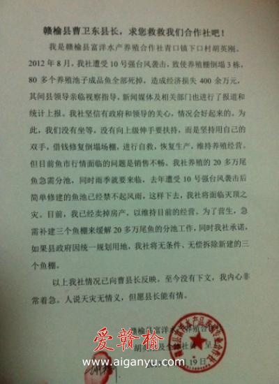 | 赣榆富洋水产养殖合作社经营难以为继盼扶持作者:胡英刚 发布时间:2013-06-23 21:20 类别:百姓权益 区域:连云港赣榆 咨询求助: 赣榆县曹卫东县长,求您救救我们合作社吧! 我是赣榆县富洋水产养殖合作社青口镇下口村胡英刚。2012年8月,我社遭受10号强台风袭击,致使养殖棚倒塌3栋,80多个养殖池子成品鱼全部死掉,造成经济损失400余万元,其间县领导亲临视察指导,新闻媒体及相关部门也进行了报道和统计上报。我社坚信有政府和领导的关心,情况会好起来的。为此,我们没有坐等,没有向上级伸手要扶持,而是坚持用自己的双手,借钱修复倒塌场棚,进行自救,恢复生产,维持养殖经营。但目前鱼市行情面临的问题是销售不畅。我社养殖的20多万尾鱼急需分池,同时雨季就要来临,去年遭受10号强台风袭击后简单修建的鱼池已经禁不起风雨,这样下去,我社将面临灭顶之灾。目前,我已经卖掉房产,以维持目前的经营。为了营生,急需补建三个鱼棚来缓解20多万尾鱼的分池工作,同时我社承诺,如果县政府因统一规划用地,我社将无条件、无偿拆除新建的三个鱼棚。 以上我社情况已向曹县长反映,至今没有下文,我内心非常着急。人说天灾无情义,但愿县长能有情。 赣榆县富洋水产养殖合作社 胡英刚及全体社员 呈上 2013年6月19日 ![]() |