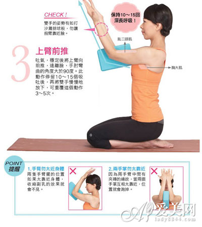 很多人明明体重不重,可是身材看起来确是变形的,身上的肉全是软趴趴的……被称为“肉松妹、泡芙妹”,其实,体重的数字不重要,曲线体态才是最重要的!下面小编给大家介绍常见的4种变形身材,以及相对应的4组瑜伽伽动作,运用毛巾、瑜伽砖、瑜伽垫等做为辅助工具,就算是没学过瑜珈的女孩也可以做到哦。减重+塑身,一次搞定!![]() 4组减肥瑜伽 3、上臂前推,吐气,稳定后将上臂向前推,远离脸,手肘弯曲的角度大于90度,此动作停留10-15个呼吸,再将双手慢慢放下,可重复这个动作3-5次。 提醒:手臂勿太靠近身体,两手掌勿太靠近。 |