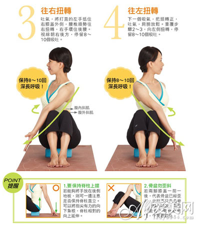 很多人明明体重不重,可是身材看起来确是变形的,身上的肉全是软趴趴的……被称为“肉松妹、泡芙妹”,其实,体重的数字不重要,曲线体态才是最重要的!下面小编给大家介绍常见的4种变形身材,以及相对应的4组瑜伽伽动作,运用毛巾、瑜伽砖、瑜伽垫等做为辅助工具,就算是没学过瑜珈的女孩也可以做到哦。减重+塑身,一次搞定!![]() 4组减肥瑜伽 3、往右扭转,吐气,将打直的左手抵住右膝盖外侧,右手环住后腰,视线朝右后方,停留8-10个呼吸。 4、往右扭转 下一个吸气,把头转正,吐气,肩膀放松,重复步骤2和3,停留8-10个呼吸。 提醒:保持脊柱上提、骨盆勿歪斜。 |