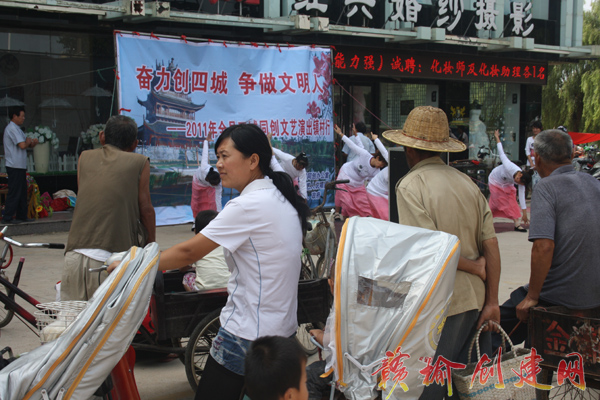为深入贯彻落实8月15日召开的全县迎接省级文明城市验收工作会议精神,进一步营造“奋力创四城,争做文明人”的浓厚氛围,扩大群众对文明城市和四城同创工作的知晓度,增强创建影响力,县创建办积极创新宣传途径,组织民间艺人说唱团编排了群众喜闻乐见的节目,深入浅出的向群众宣传我县创城的目标、措施及所取得的成绩,不仅娱乐了大众,丰富了群众的娱乐文化生活,同时,号召全县人民奋力创四城,争做文明人。此次活动将一直持续到11月中旬结束。 (匡立冬)