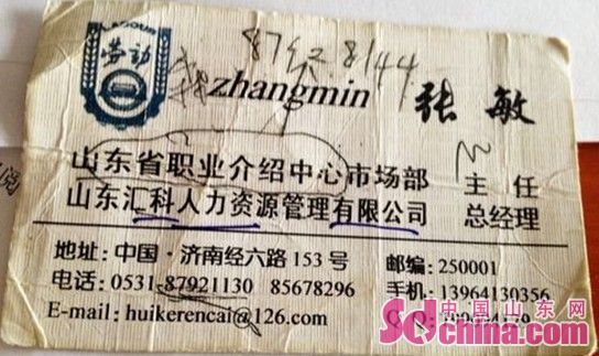 位于济南市经六路153号的山东省职业介绍中心 名片显示,张敏是山东省职业介绍中心市场部主任、山东汇科人力资源管理有限公司总经理。 中国山东网6月1日讯(记者 张帅)“去澳洲留学加工作,年薪20万”,在一张非法小报上看到的广告让马上面临毕业的周长科怦然心动,对方声称是山东省职业介绍中心直属单位,又让周长科吃了一颗定心丸,他开始按照对方的要求一步步地走向一个陷阱,直到六万多块钱至今无法追回,而自己的出国梦也破碎了。 出国被拒签 费用追讨难 家住泰安市东平县的周长科按照广告上的地址找到了这家名为“淄博智澜培训学校”的公司,该公司的负责人马晓慧告诉他,公司是“山东省职业介绍中心市场部”的代理。为了核实真实性,周长科来到了山东省职业介绍中心市场部并见到了名叫张敏的负责人,该负责人信誓旦旦地称自己是“山东省职业介绍中心的直属单位”并承认了自己跟马晓慧的代理关系,这让周长科一家信以为真并开始按照对方的要求办理相关的款项。 在周长科与马晓慧签订的《赴澳大利亚语言学习代办协议书》上,记者却发现,甲方并非淄博智澜培训学校,而是澳大利亚ICN教育集团济南代表处,协议上也任何单位公章,只是双方分别签字并按了手印。 为了筹措去澳大利亚的费用,周传科的父亲选择了在当地邮政储蓄银行贷款,以一年利息9504元的代价获得了六万元的出国费用。在马晓慧和张敏的要求下,周传科先后把54600元的出国费用和3600元所谓办理存款证明的费用达到了马晓慧的账户上。 周传科美好的出国梦伴随着2012年2月底的一个电话开始破碎,张敏称接到使馆的电话,周传科被拒签。他开始找到张敏打算要回自己的出国费用,对方以“钱在澳大利亚”为由让周传科等待并趁机向周传科介绍另一项“业务”:去新加坡工作。天真的周传科还没有意识到已经走进对方的圈套,对方开始以介绍工作为由要求周传科缴纳去新加坡的费用并安排其去上海进行面试。2012年4月13日在上海面试失败的周传科得到一个更崩溃消息:当天面试的人中只有自己一个人缴纳了35000元的中介费。此时大梦初醒的周传科开始不断要求对方退还款项,但得到的答复始终是钱在澳大利亚,需要等待。 山东省职业介绍中心“市场部”:我们会按照协议退款 6月1日上午,记者来到位于济南市经六路的山东省职业介绍中心,省职业介绍中心的工作人员告诉记者,所谓的市场部在二楼,但实际上跟省职业介绍中心不是一个单位并没有关系,而只是在二楼租赁的办公场所。记者按照工作人员的指示来到二楼,发现职业介绍中心主任室的对面就是张敏的“市场部”,而中心的办公室、主任室跟这个 “市场部”在外观上与其他科室并无二致,很难区分。 在“市场部”,记者并没有见到张敏,办公室里一位姓冯的工作人员告诉记者,周传科是因为自己的原因导致澳大利亚拒签以后去新加坡的事情也一次次失败的。“周传科一开始确实是去淄博的公司不假,但是并没有把钱打到我们这里”,对于跟淄博的马晓慧是不是存在代理关系,该工作人员矢口否认,并称济南公司跟马晓慧的公司是独立的没有关系的两个法人,但当记者问到那为何钱给了马晓慧却是由张敏方办理出国事宜的时候,该负责人含糊的表示过去的细节就不要再追究了。 该工作人员告诉记者,自己曾经出于同情周传科所以才“帮忙”,在周传科主动要求去新加坡的前提下多方联系用人单位,办理相关手续,但是周传科挑三拣四最终导致未能成行,她认为这完全是周传科的责任导致的单方面违约。“他现在来要钱,很简单,只要拿着协议我们按照协议退给他两万多就可以了”。 山东省职业介绍中心:张敏跟我们没关系 同样的办公地点、一样的外观,周传科认为自己之所以一而再再而三的相信张敏,跟对方一直宣称自己是山东省职业介绍中心直属有着很大的关系。在周传科提供的一张张敏的名片上记者看到,张敏的个人介绍为“山东省职业介绍中心市场部主任”、“山东汇科人力资源管理有限公司总经理”。据了解,山东省职业介绍中心是隶属山东省人力资源和社会保障厅的经费自理事业单位,那么张敏究竟跟省职业介绍中心什么关系呢? 对此,记者联系了山东省职业介绍中心的谭主任,谭主任告诉记者,二楼所谓的“市场部”其实是一家名为“汇科人力资源管理有限公司”的民营单位,与省职业介绍中心并没有任何的关系。由于省职业介绍中心的办公场所有闲置空间,所以几年来一直租赁给这家公司办公,但对于这家公司所从事的业务并不了解。谭主任表示,自从这几天不断的有人找到这里要求退款之后,自己也不胜其烦,由于处在一个办公地址,对方的行为已经给省职业介绍中心造成了很不好的影响。至于张敏宣称自己是市场部的主任,谭主任表示自己也是这几天才知道的。“我们已经跟她谈过了,告诫她不能打着我们的名义经营,而且我们已经打算终止租赁将对方撵走”,谭主任说。 业内人士:这极有可能是诈骗 对于周传科在办理出国当中的遭遇,记者联系了澳际留学从事留学业务的主管王涛,在说明情况后他告诉记者,以现在他所供职的澳际留学为例,办理澳大利亚留学的话一般是八千到一万的价格,这部分钱算是中介机构办理的酬劳,是属于中介机构的收入,不存在将这部分费用汇到国外去的情况,即使国