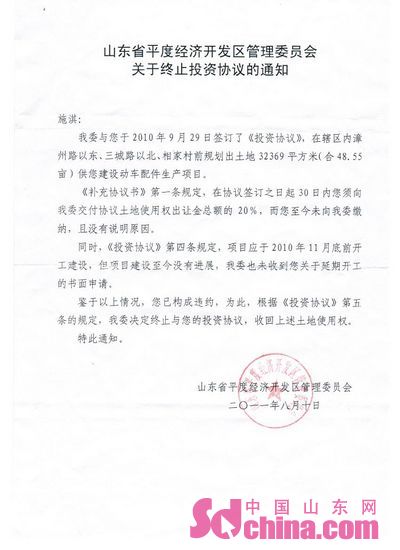 2011年8月10日平度开发区发给施先生的协议终止通知 8月12日平度市开发区管委会副书记董玉玲批示,“请土地建设局,大泥管区阅办,与企业搞好对接,做好群众工作,尽快使项目早开工,早建设”,此时协议却已经被告知终止。 中国山东网12月2日讯 来自浙江的投资商施先生遇到了进退两难的麻烦,一方面自己的投资合同已经开始执行,另一方面又被告知执行违约而被终止了合同。在浙江做生意一直比较顺利的施祺在青岛平度遭遇了一次“滑铁卢”。 招商引资一直是基层县市发展经济的一张“王牌”,能够吸引投资商也是当地政府部门求之不得的事情。但是施先生没有想到,自己这只“金凤凰”却被当初温情脉脉的招商方下了“逐客令”。 2010年9月29日,在经过多次考察之后,客商施先生与山东省平度经济开发区管委会签署了投资协议,约定在“平等互惠,共同发展”的原则下由乙方设立总投资为8000万元人民币,注册资本不低于1000万元人民币的项目,主要用于经营动车配件生产。当天多个项目的签约仪式上,平度市于显祥市长、王福考副市长均现场出席,当地电视台对此进行了报道。“当时的企业代表都做了发言”,施先生这样告诉记者。 协议签署的第二日,施先生向负责招商引资的工作人员表示要缴纳20%的土地出让使用权的定金,时任开发区管委会招商局局长刘洪胜则以“土地款需要办理土地手续时缴纳”为由拒绝了这一要求,并表示时间另行通知。<详细> |