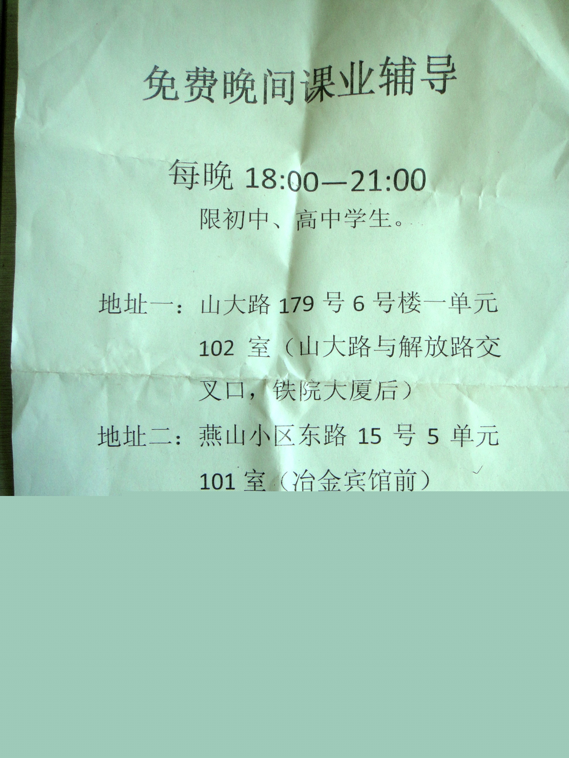 前几天在我家楼下,看见一个这样的广告,上面说每天晚上的18点到21点免费晚间课业辅导,针对初中、高中学生,不知道这是不是真的,希望记者能去调查一下,感觉有些不放心。这是我拍的照片。