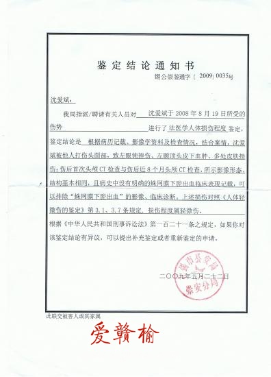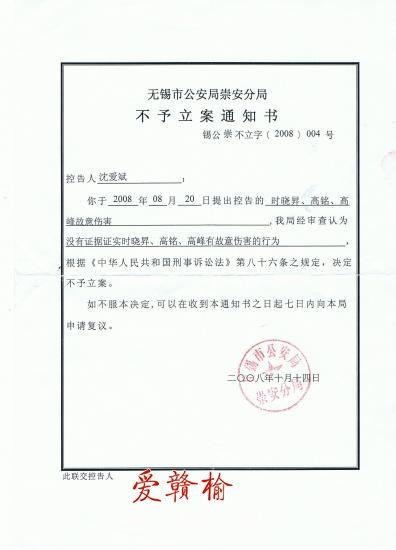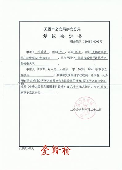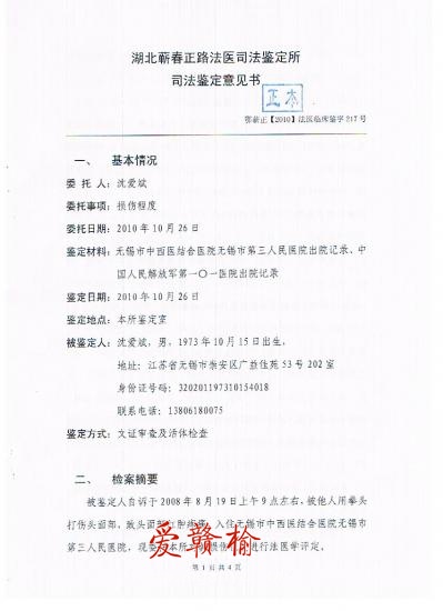 | 投诉无锡崇安公安分局行为涉嫌渎职违法作者:匿名网友 发布时间:2013-04-22 22:45 类别:执法监督 区域:无锡崇安 投诉报料: 尊敬的领导:您好! 我叫沈爱斌,党员,2002年从部队转业到无锡市崇安区城管行政执法大队,身份证号码:3202011973XXXX4018,住址:无锡市太湖花园三区55号601室。 2008年8月19日上午9时许,我到无锡市崇安区城管行政执法大队 大队长时晓昇的办公室,依据《公务员法》和《江苏省公务员考核实施办法》的相关规定,要求时晓昇把评定本人2007年公务员考核为基本称职的依据拿给我,谁知,他却在办公室内将我殴打一顿,而在我被殴的整个过程中,我都没还手!! 殴打之后,110民警徐刚接警,并开车将我带到三院就诊,拍好脑部CT后,医生强制让我住院,说我不能动,脑部有出血,于是在13时,我住院了,同时,我立即把伤情告诉了派出所,派出所也立即到医院了解了情况,并给我拍了照。 时晓昇在派出所的帮助下,第一时间得知我的伤势,知道蛛网膜下腔出血已构成轻伤,为了逃避法律制裁,一方面让协同犯高峰和高铭来做伪证,把他打我致伤说成是我自己撞墙所为,并在派出所做了证人证言笔录;另一方面,在派出所的帮助下,在已经做好笔录后,又从派出所出去,制造伪证,将他自己将右手掌骨“弄伤”,并到派出所做笔录指控是我所为,诬陷我,还也到市公安局那里“弄”了一份构成轻伤的鉴定报告,以此来抗衡我的轻伤。 08年9月26日崇安分局根据市局薛春生法医的结论,再以崇安分局名义给我鉴定结论:头部损伤已构成轻伤。 派出所和时晓昇本以为这样我就不敢追究时晓昇的责任,我如追究时的责任,时就追究我的责任,想用他的伪证来抗衡他将我打伤构成的轻伤。而且,还找两个队员做伪证。 时晓昇将办案机关买通后,崇安公安分局既不对证人证言进行查证,又不对我的客观伤势作任何调查,决定不予立案。 在给我不予立案复议决定书后,崇安公安分局法制科诸宇魏(现在已辞职)科长把我叫到他办公室,对我说:“证据对你不利,有两个证人证明你是自己撞墙的,所以我们决定不予立案”。 10月24日我向崇安区检察院申请立案监督。 09年1月初我向区检察院提出,要求公安根据我的伤势特征做致伤物推断鉴定。 在我申请立案监督三个月后(2009年1月),崇安区检察院才看到案卷,杜科长口头给我答复:案情与我陈述基本相同,从目前来看,不能要求公安机关给我立案,但不予立案依据不充分,因为案情没有查明,考虑到两家关系,不给公安发文书,并说他们已经与公安联系,要求公安查明案情。 区检察院与分局联系后,分局感到很大压力,因为案情都没查明就决定不予立案,我可以控告分局渎职,于是,2009年2月份,崇安分局就以区政法委名义组织调解,但他们始终在包庇时晓昇,只同意赔我药费,不同意处理大队长等人,在09年3月底谈崩。 在我完全不知情的情况下,4月28日中午,通江派出所华晨阳副所长、丁未、分局法制科周琪还有市公安局法医薛春生四人将我带到江苏省公安厅,故意将我的轻伤改为了轻微伤。 2009年5月22日上午,崇安公安分局又给我一份人体损伤程序鉴定,结论是排除“蛛网膜下腔出血”,损伤程度属轻微伤,但结论中结合案情认定我是被他人打伤!!分局法制科周琪说,结论上的内容是从省厅法医科的结论上一字不改转给我的。 让我纳闷的是,无锡市三院、无锡市医管中心、无锡市人民医院都认定我脑部有出血。 随后,我立即与江苏省公安厅负责给我鉴定的周科长联系(电话:02583526562),周科长说“排除蛛网膜下腔出血”的结论是省厅聘请省人民医院专家会诊得出的结果。 09年6月17日,省人民医院最权威专家韩修龄给我得出“微出血不能排除”的诊断(有病历)。接着,我又到南京市鼓楼医院,专家得出“少量出血可能”的诊断(有病历)。然后我又到省中医院,专家得出“有少量出血不能排除”的诊断。 09年6月26日,我到上海华山医院,诊断结论为:出血不除外(有病历)。 为什么这么多医院都诊断我脑部有出血,唯独省厅周科长聘请的医生却“排除出血”呢? 而早在08年9月22日,无锡市医管中心就曾召集无锡市三家医院专家对我CT片进行了会诊,明确告知我,我的头部有出血(有确凿证据)。 更为滑稽的是:崇安分局法制科诸宇魏科长(现已辞职)以我不在轻微伤鉴定通知送达回执上签“不需要公安机关补充或重新鉴定”为由,拒绝将借我的4张原始CT片还我,还威胁我:“以后不要掉到我手里!!” 自2009年7月23日至今(2013年4月22日),我已向无锡市公安局、崇安分局、办案派出所、省公安厅、省人民政府以邮政挂号信的方式七次向他们递交要求查明案情和《重新鉴定申请书》,但至今无人问津。 2010年10月26日,本人委托湖北蕲春正路司法鉴定所为我做损伤程度鉴定,结果是构成轻伤!!!! 但我注意到:轻微伤鉴定结论中有两层意思,一是排除蛛网膜下腔出血,二是认定我头部的伤是被他们打伤的。针对第二点,我又咨询了周科长,他说他是根据案情综合分析得出我是他伤。如果案情没有在到省公安厅之前改变的话,那无锡市公安局和崇安分局在没有出具轻微伤结论之前又为何没能根据案情综合分析呢?如果我是被他人殴打致轻伤,请问:崇安分局应当给我立案吗?难道我的案情在到省公安厅鉴定前改变了吗? 08年9月26日鉴定构成轻伤,在决定不予立案后又为何要在8个月后为我重新鉴定?理由是什么?为什么在