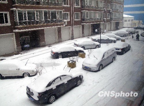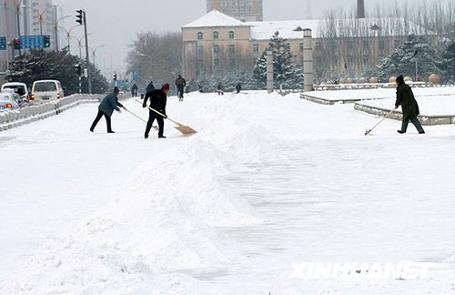 11月14日,长春市文化广场职工在清理广场积雪。新华社记者 齐海山 摄 |