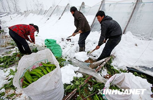 11月13日,河南省滑县慈周寨乡孙白社村农民在被大雪压塌的大棚抢收蔬菜。