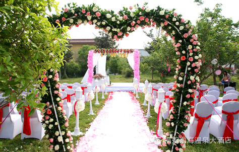 翠绿的青草,鲜花和绿叶做成的拱门圈出主会场,地毯上铺满了鲜花。珠光牙白的婚纱礼服,把新娘装扮得无比娇媚。灿烂的阳光下,蓝天为你们作证,在如茵的草坪上接受亲友们的真诚祝福。孩子们在青草地上嬉闹,躺在绿草的怀抱里享受大自然的气息,欢快喜庆的气氛充满着这个值得纪念的美好日子。