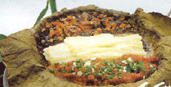 掌握关键:猪肉必须先用调味腌渍入味。米要炒至色黄才香。肉块要用新鲜荷叶裹包蒸熟才有清香味。